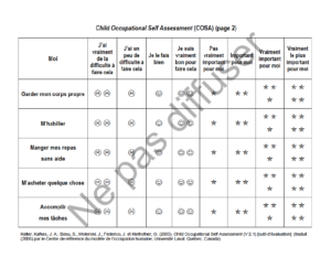 Compléter le COSA facilite la participation et l’engagement de l’enfant dans le processus thérapeutique; les activités pour lesquelles l’enfant se sent le moins compétent, mais pour lesquelles il accorde une grande importance devraient être adressées de manière prioritaire dans les interventions ergothérapiques.